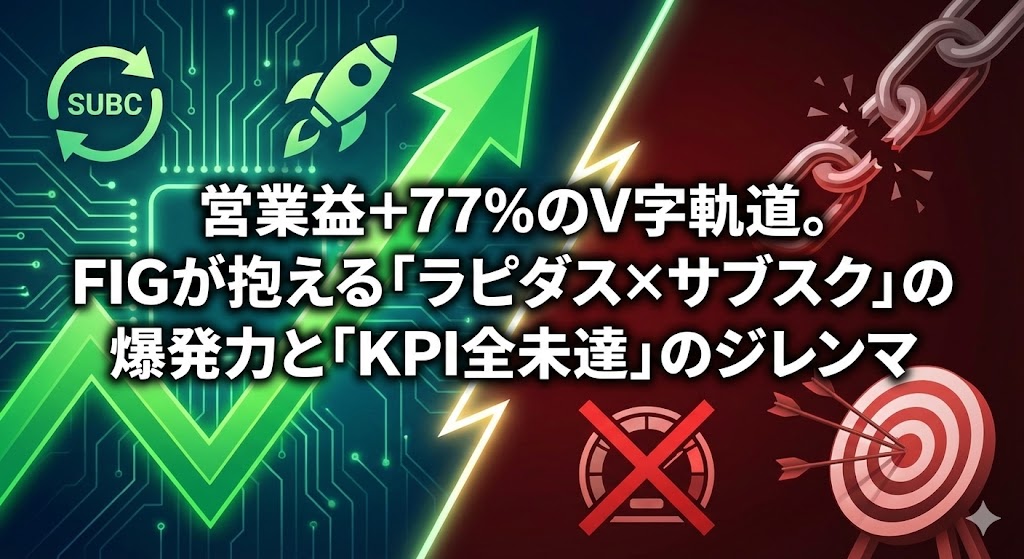 FIG株式会社は、2024年12月期に匠CB全額減損(16.93億円)で最終赤字に転落したものの、2025年12月期はQ3累計で営業利益+77.9%と明確なV字回復軌道にある。 サブスク売上高46.5億円・約21万件の契約基盤を持つIoT×SaaS事業が安定収益を生む一方、ラピダス向けAMR導入や自治体キャッシュレス展開といった新たな成長ドライバーが育ちつつある。ただし中期経営計画のKPIは全項目未達で1年延長を余儀なくされ、プライム市場の流通株式時価総額基準も未充足が続く。PER 12.9倍・PSR 0.77倍とバリュエーション面では割安だが、営業利益率3%台の低収益体質と上場維持リスクが株価の重荷となっている。